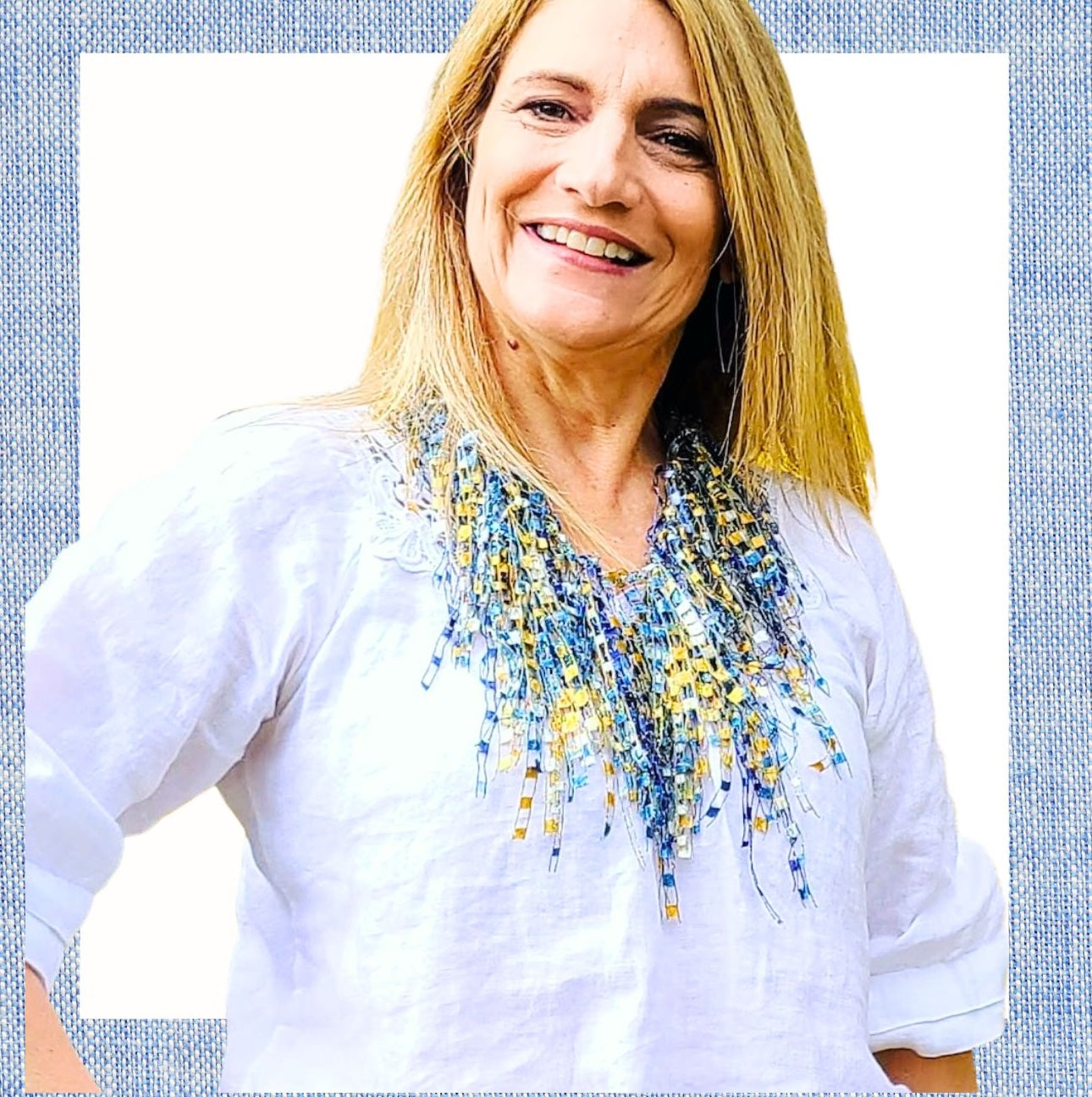 3. The Scarf Necklace Triple Loop is shorter and more of a BIB Necklace Look. Creates a striking statement piece. Also, ideal when something dangling is not appropriate (ie. cooking or bending down around small children) or wearing a simple t-shirt.